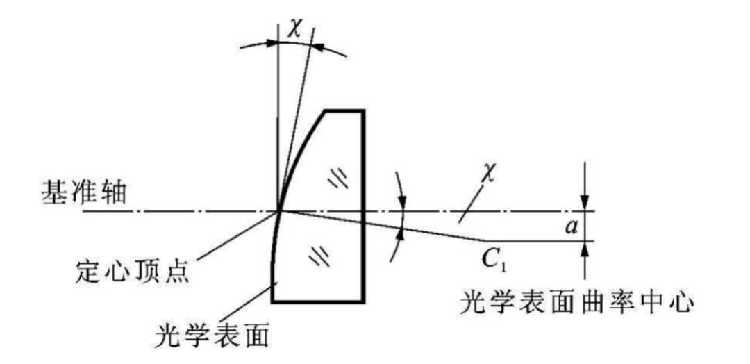 表征透镜的基准轴与光轴之间的偏离程度。具体定义为:光学表面定心顶点处的法线与基准轴之间的夹角,称为面倾角(用χ表示)。该偏差直接影响透镜的成像质量与装配性能。