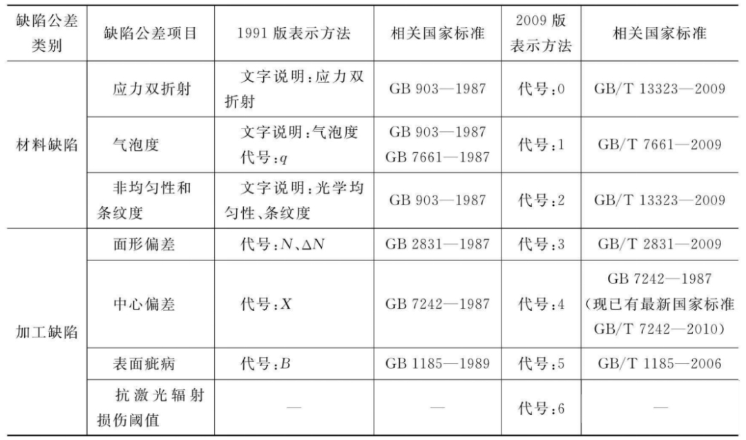 在光学图纸中,关于材料和加工缺陷公差的表达方式存在新旧差异。例如:
